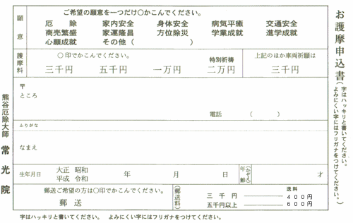 | 申込・送金先 | 〒360-0001 埼玉県熊谷市上中条1160 熊谷厄除大師 常光院 |
